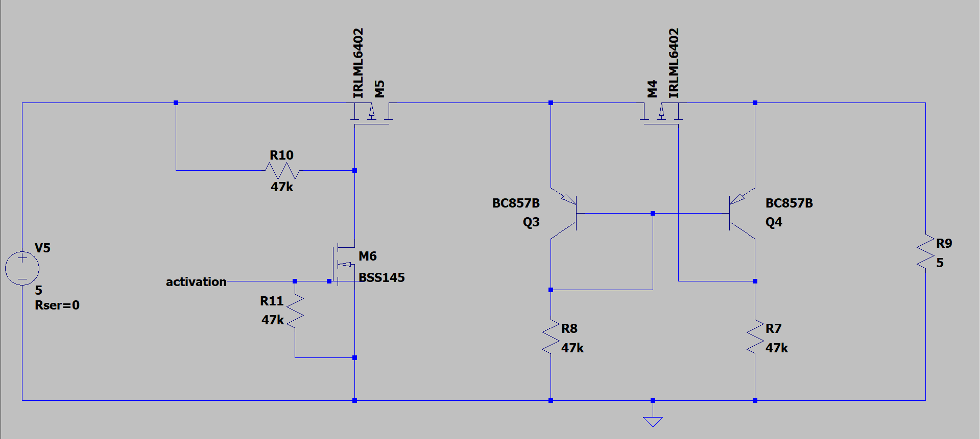 M6 is a small N-channel MOSFET, low power and small footprint, which when activated, pulls M5 gate to ground to turn M5 on. By default, M6 is off by the effect of pulldown resistor R11 unless “activation” signal arrives at its gate.