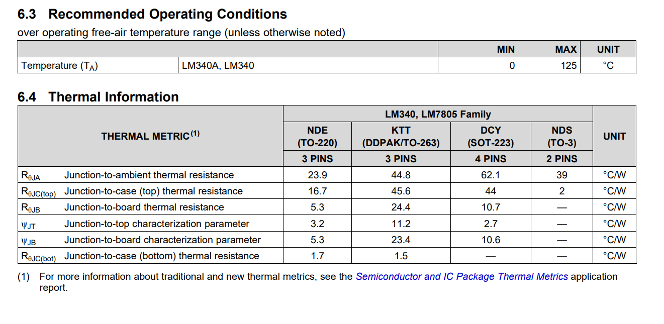 7805 from TI delivers 5 V which means a dropout of 7 V, dissipated power is 2.1 W. Here are the junction temperatures for each package it offers (page 4):