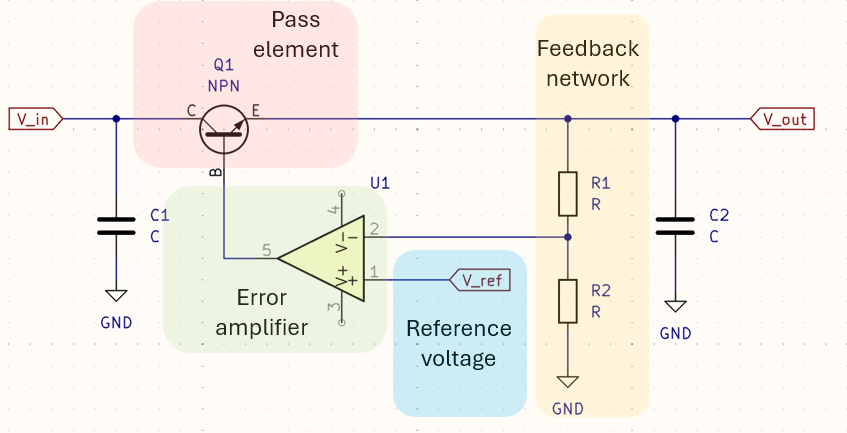 By the work of these fundamental building blocks, the linear regulator achieves its task of regulating the output voltage.